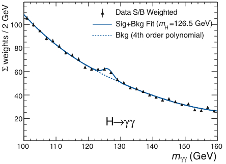 Setelah kita memahami jumlah latar yang dapat kita harapkan, selanjutnya kita membandingkannya dengan data yang diperoleh dari eksperimen. Dalam data ini terdapat tidak hanya latar namun juga sinyal. Apabila pada energi tertentu kita amati lebih banyak foton dari yang dapat kita harapkan dari latar semata, maka kita boleh yakin bahwa jumlah foton ekstra ini diakibatkan oleh peluruhan boson Higgs.