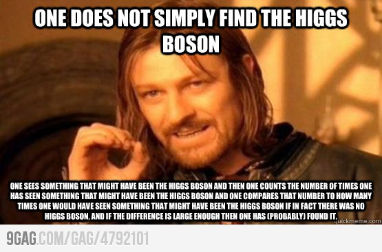 Dengan kata lain, kita yakin 99.9999999 persen bahwa ekses zarah ini diakibatkan oleh peluruhan boson Higgs. Dari angka inilah kita kemudian dapat menyatakan bahwa boson Higgs “telah ditemukan”, karena kita tahu bahwa kemungkinan bahwa ini hanyalah latar amat sangat rendah.